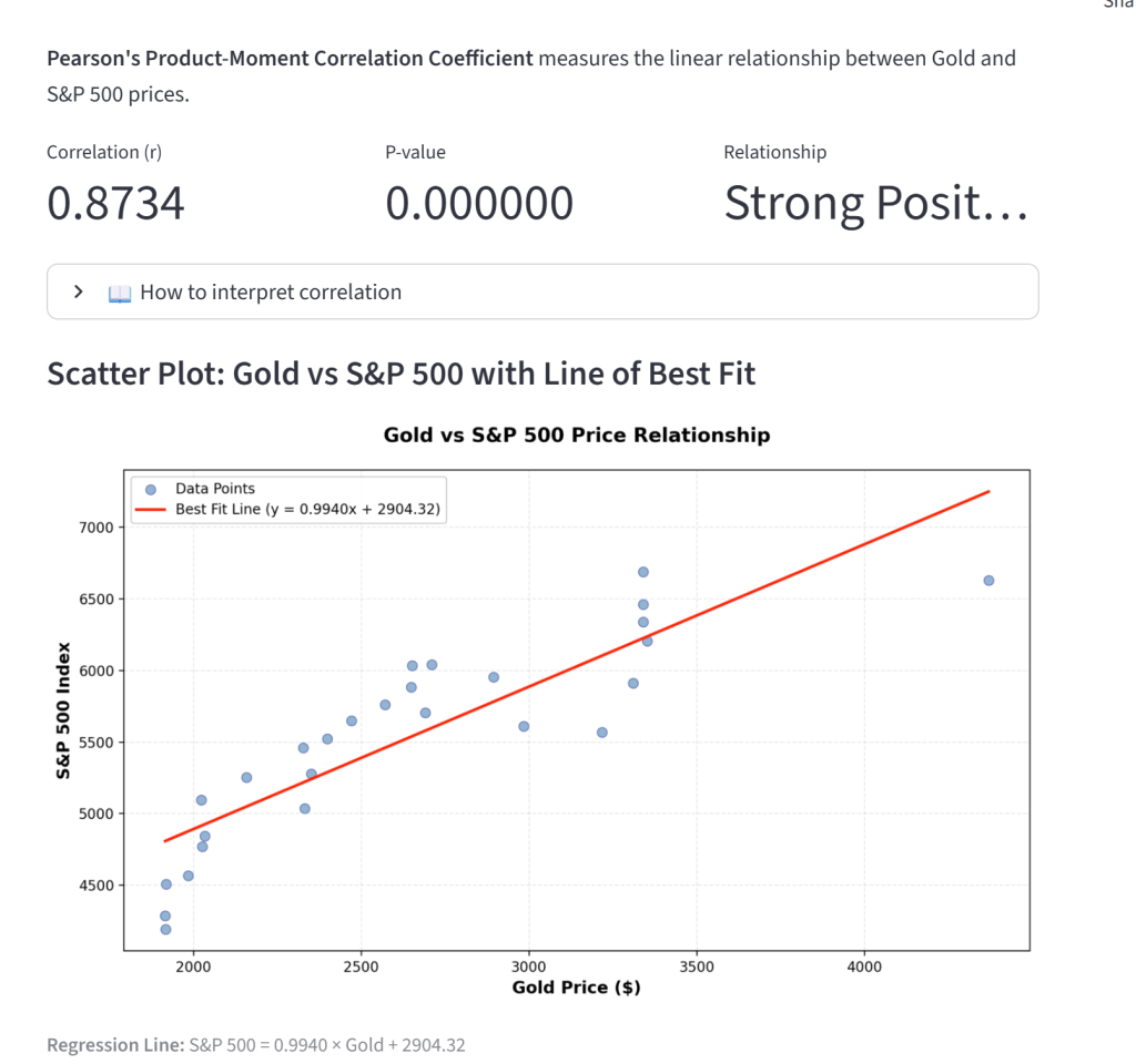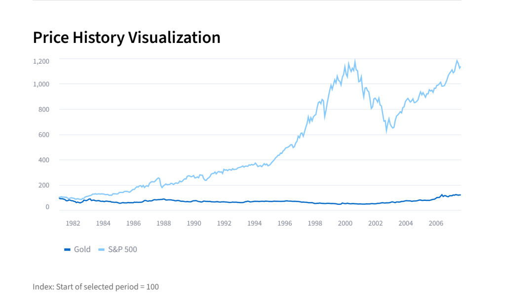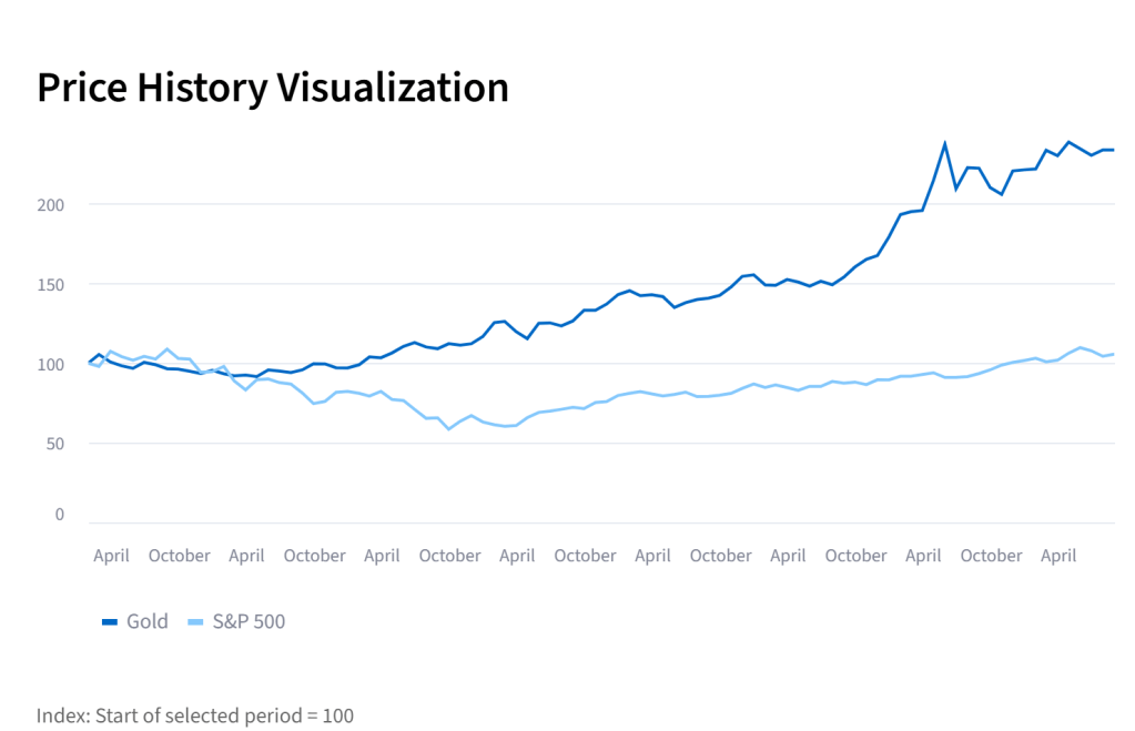Let’s take a look at the data – I threw together a dashboard comparing the month-by-month performance of gold prices compared to American equities, which I used the S&P 500 to act as a proxy of (with hardware upgrades, I may soon be able to model at a more granular level – let me know if that’s something you’d like to see). Here’s what the overview looks like: